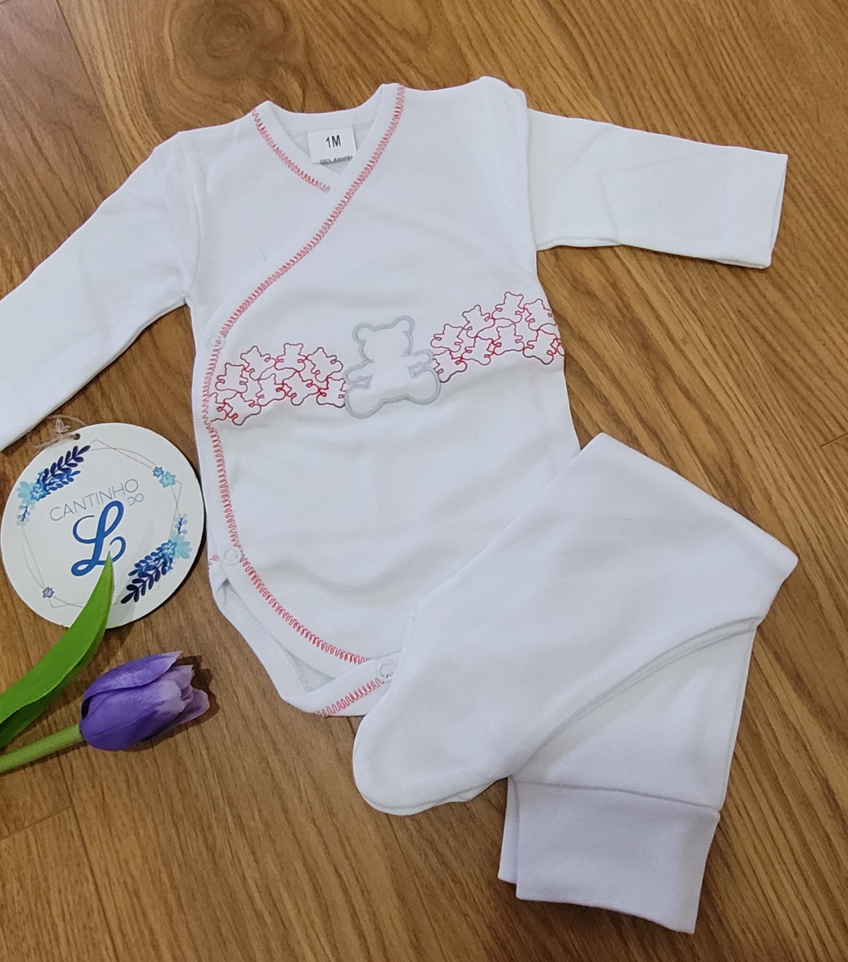 • Conjunto de roupa branco para bebé com bordado de urso e calças com pés