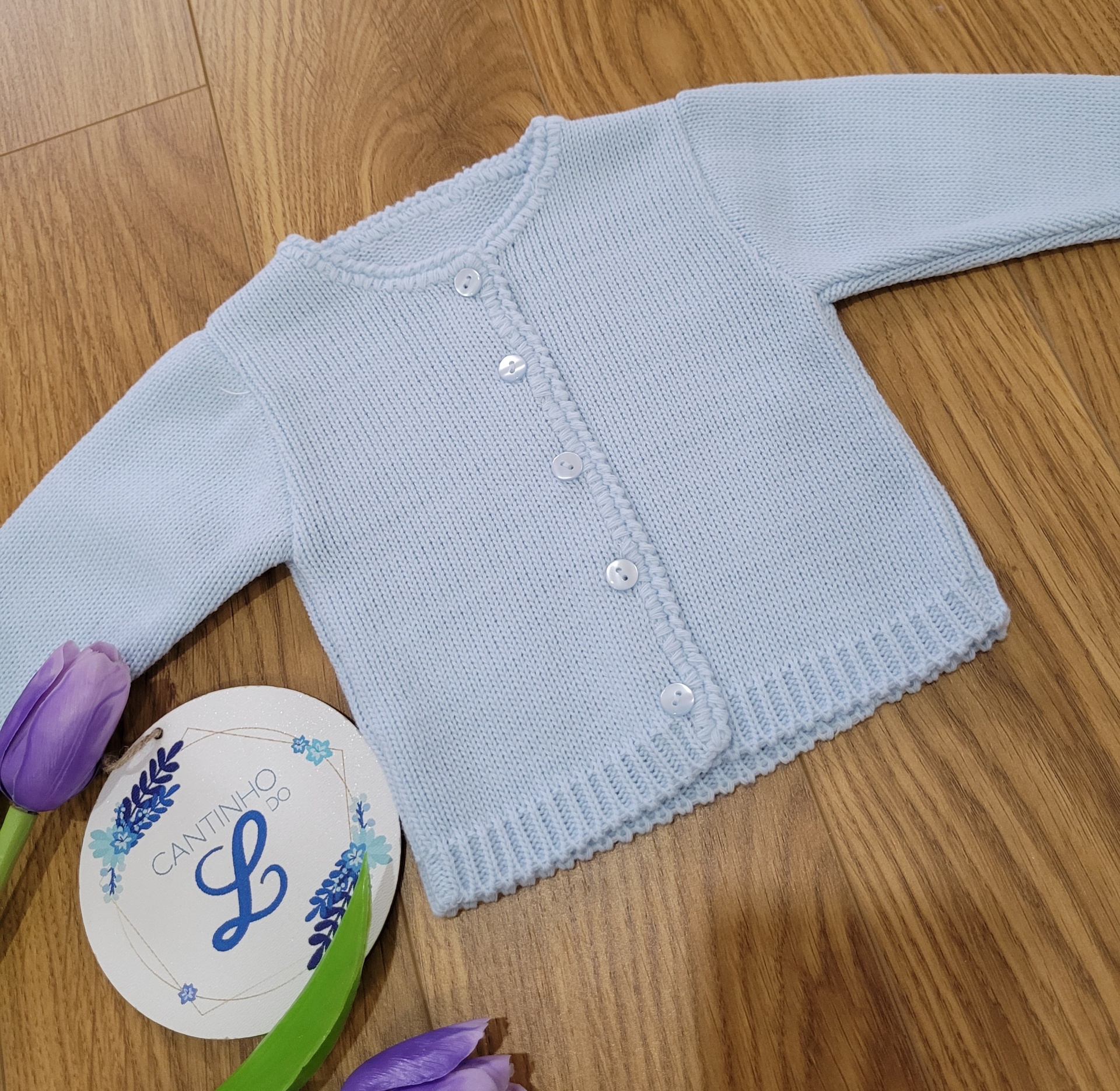 • Camisola azul clara de bebé em malha com botões brancos sobre chão de madeira com flores roxas e cartão redondo