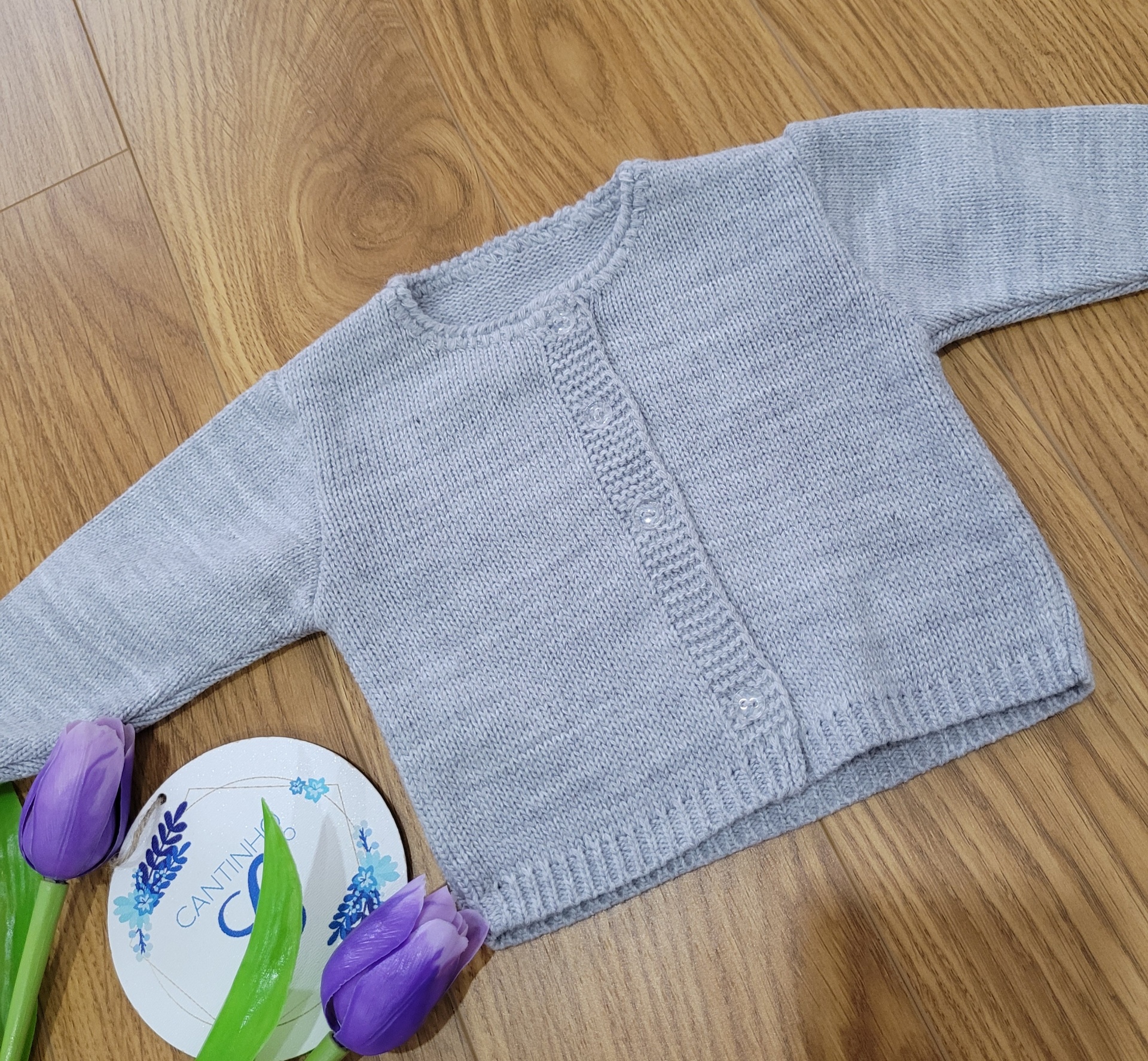 Camisola de malha cinzenta para bebé juntamente com tulipas roxas e embalagem redonda