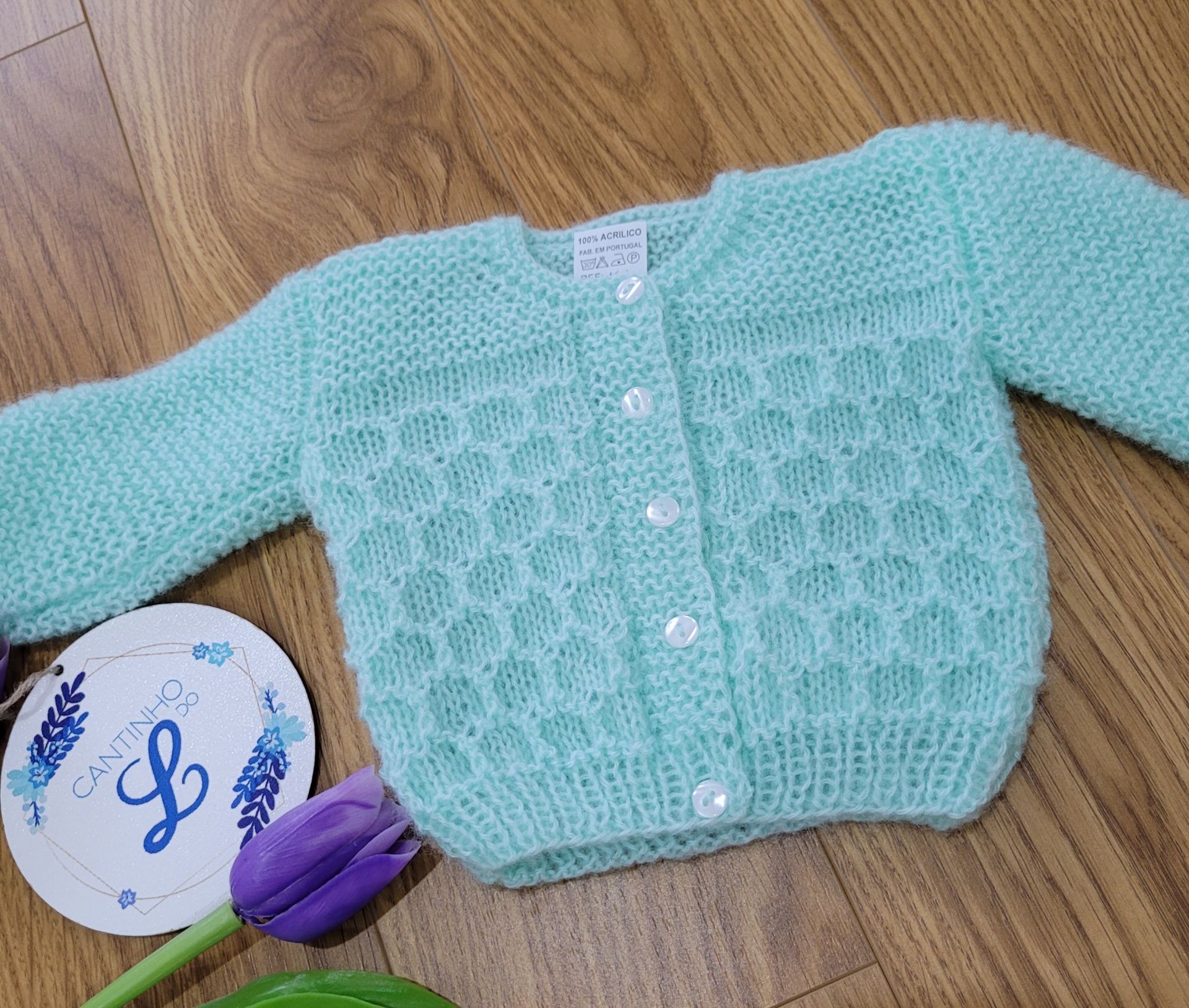 • Cardigan de bebé azul claro com botões brancos sobre madeira, cartão redondo e flor roxa