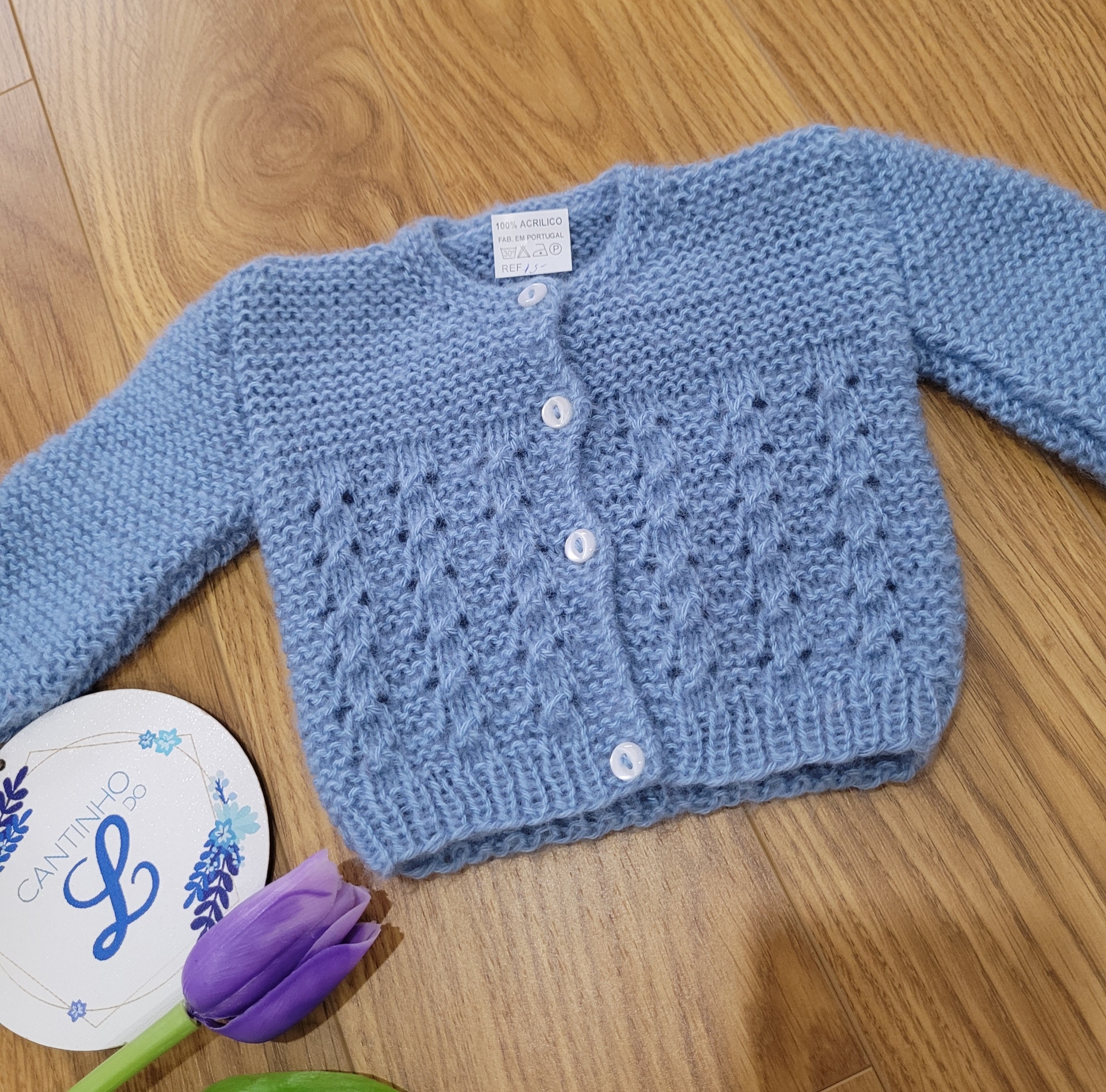 • Casaco de malha azul claro para bebé com botões e padrão calado posto sobre madeira com flor roxa e prato branco