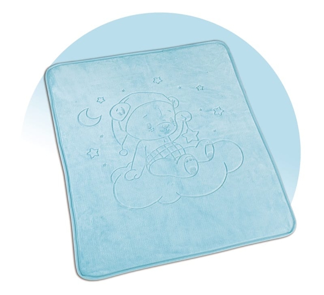 • Cobertor infantil azul claro com urso a dormir em nuvem e estrelas em relevo