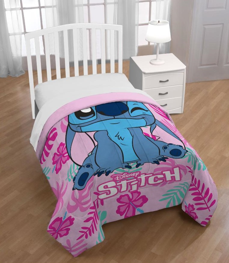 Colcha infantil estampada com Stitch da Disney em cama branca num quarto com mesa e candeeiro