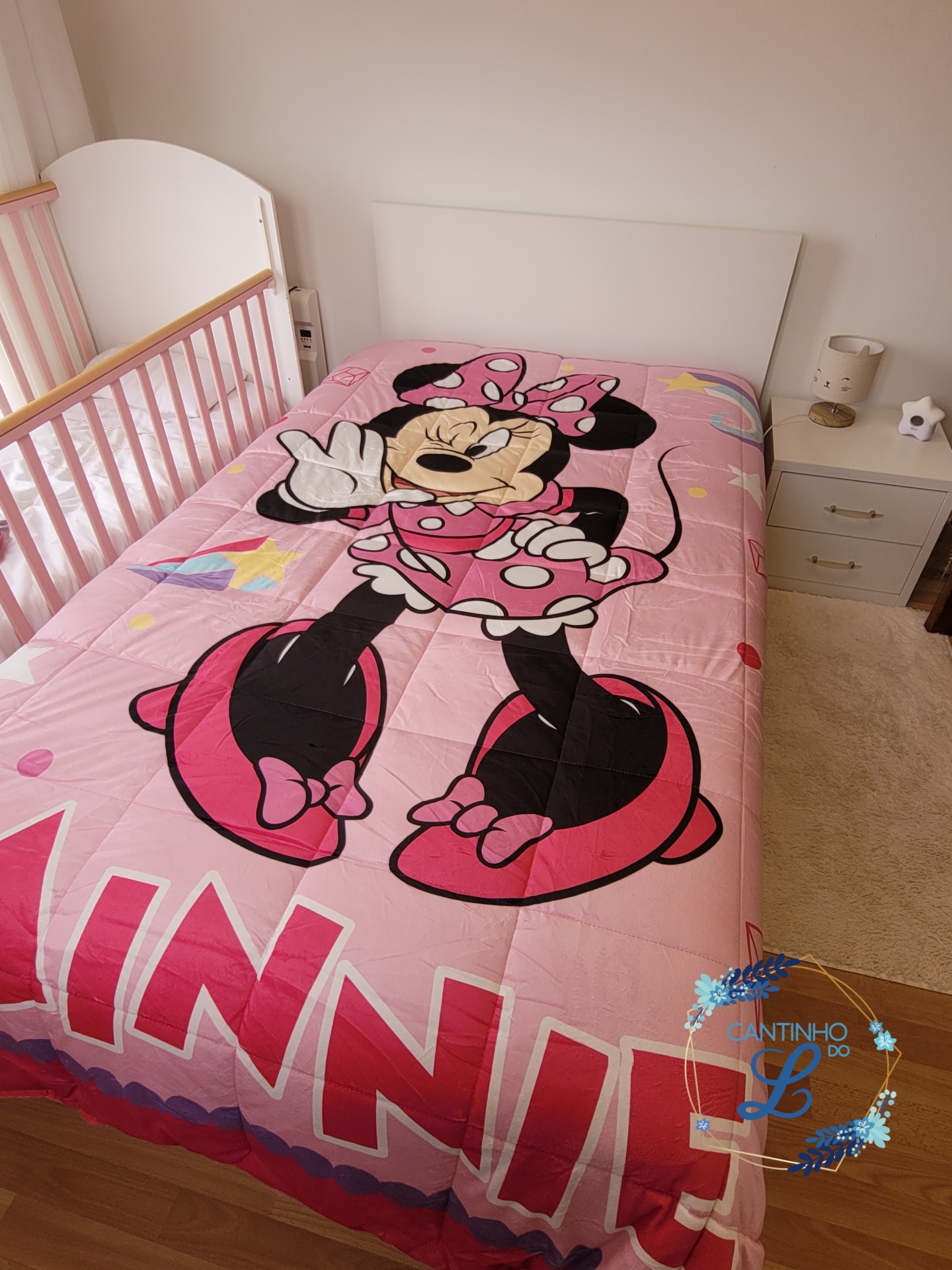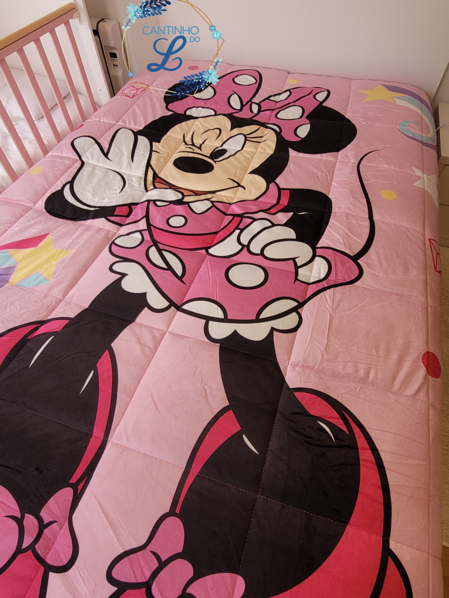 Edredão cor-de-rosa com personagem Minnie Mouse em cama branca num quarto infantil