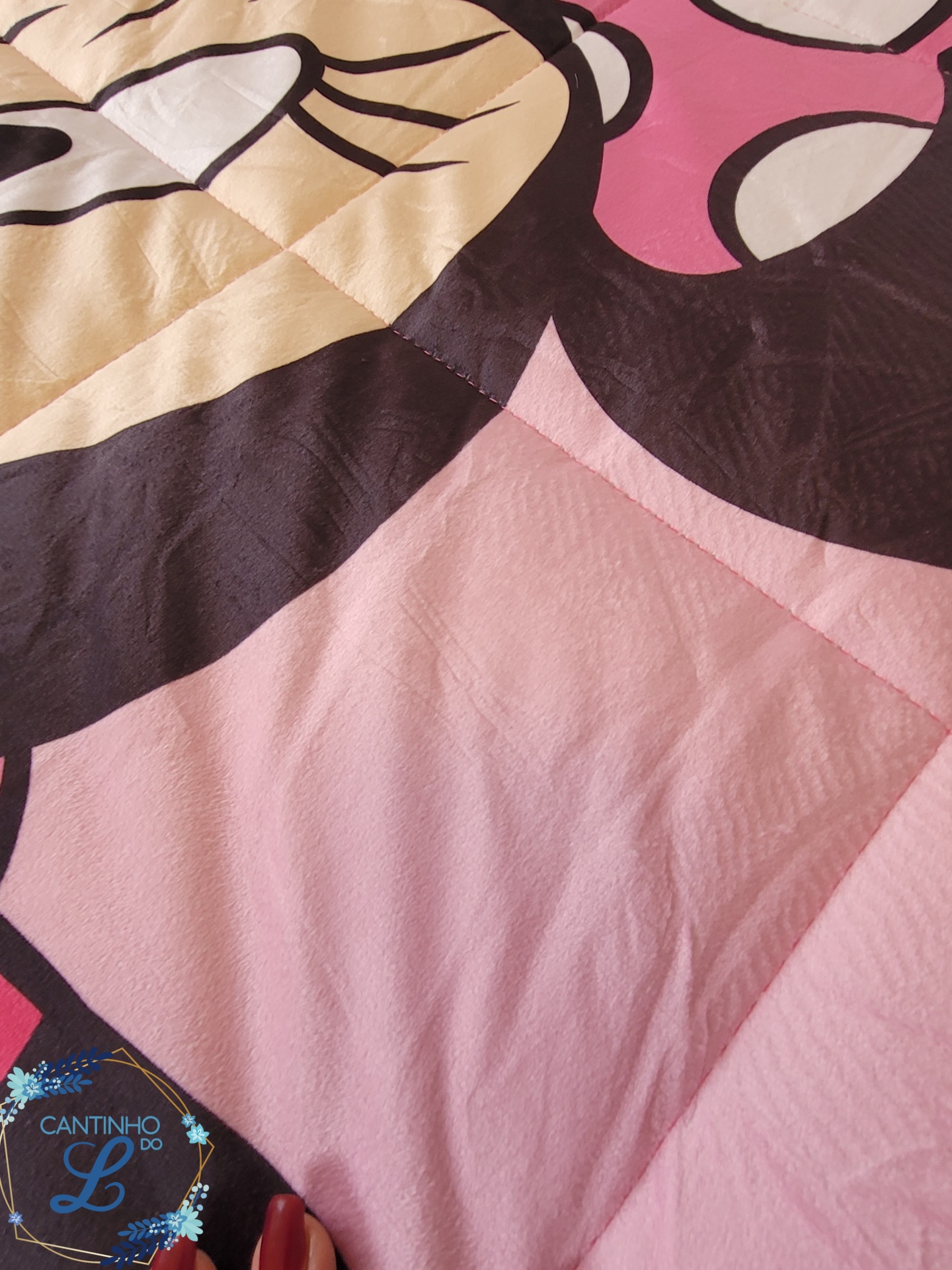 • Edredão rosa com estampa da personagem Minnie Mouse na cama