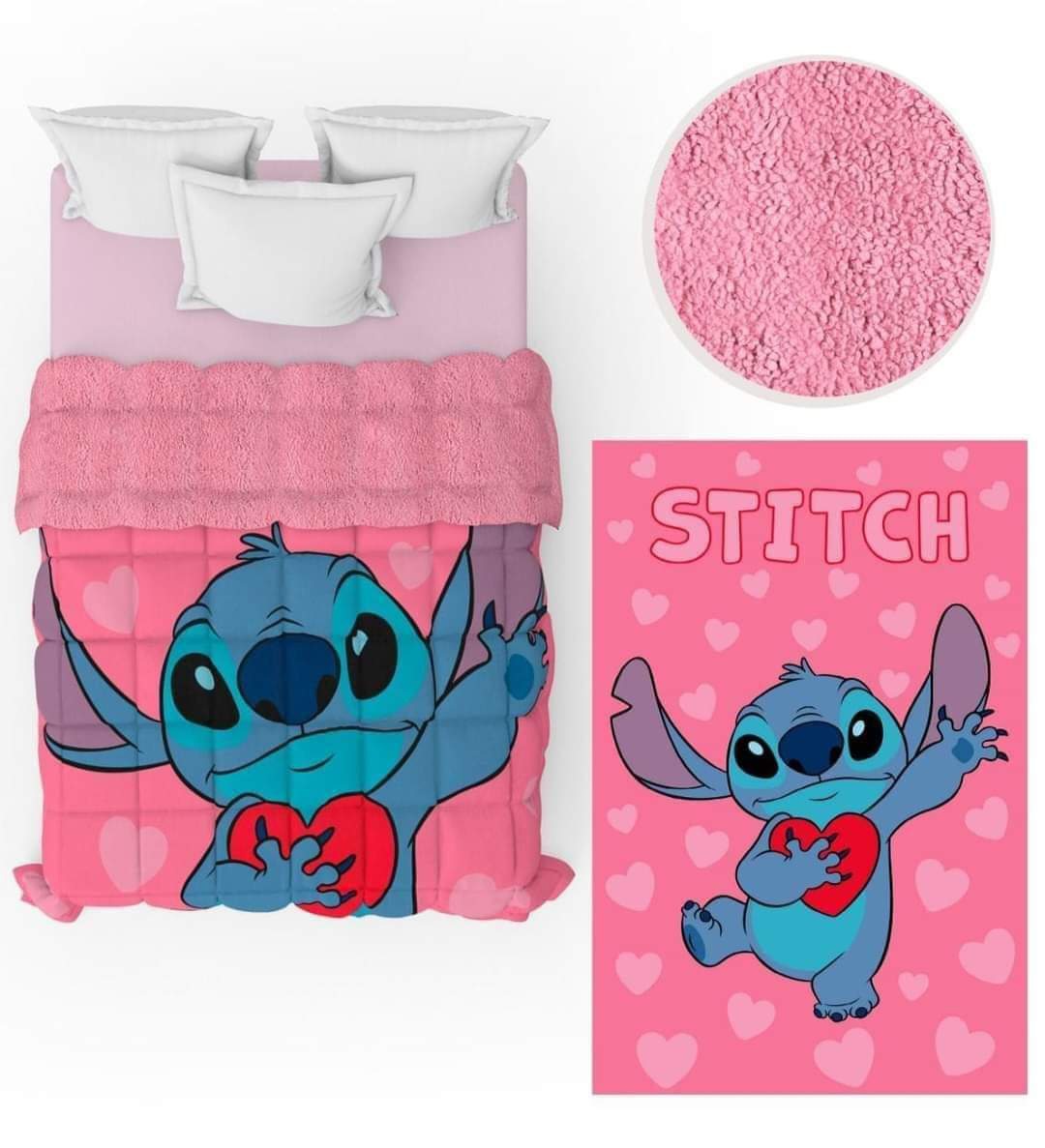 • Conjunto de cama rosa com estampado Stitch a segurar coração vermelho