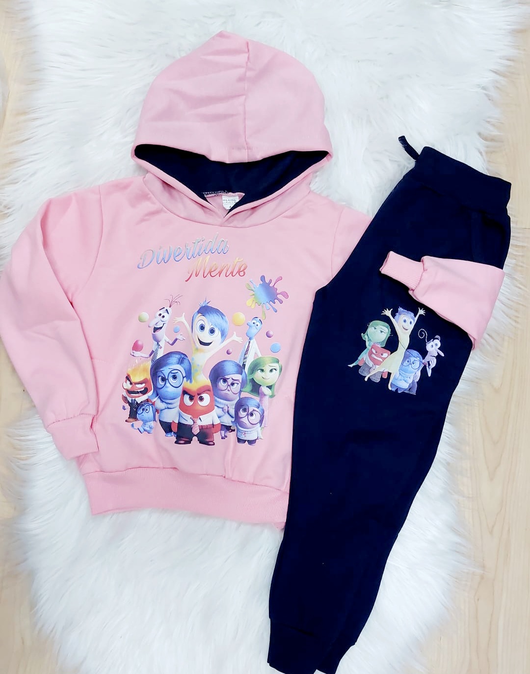 Conjunto de roupa infantil com hoodie rosa claro e calças azul escuras com personagens do filme Divertida Mente