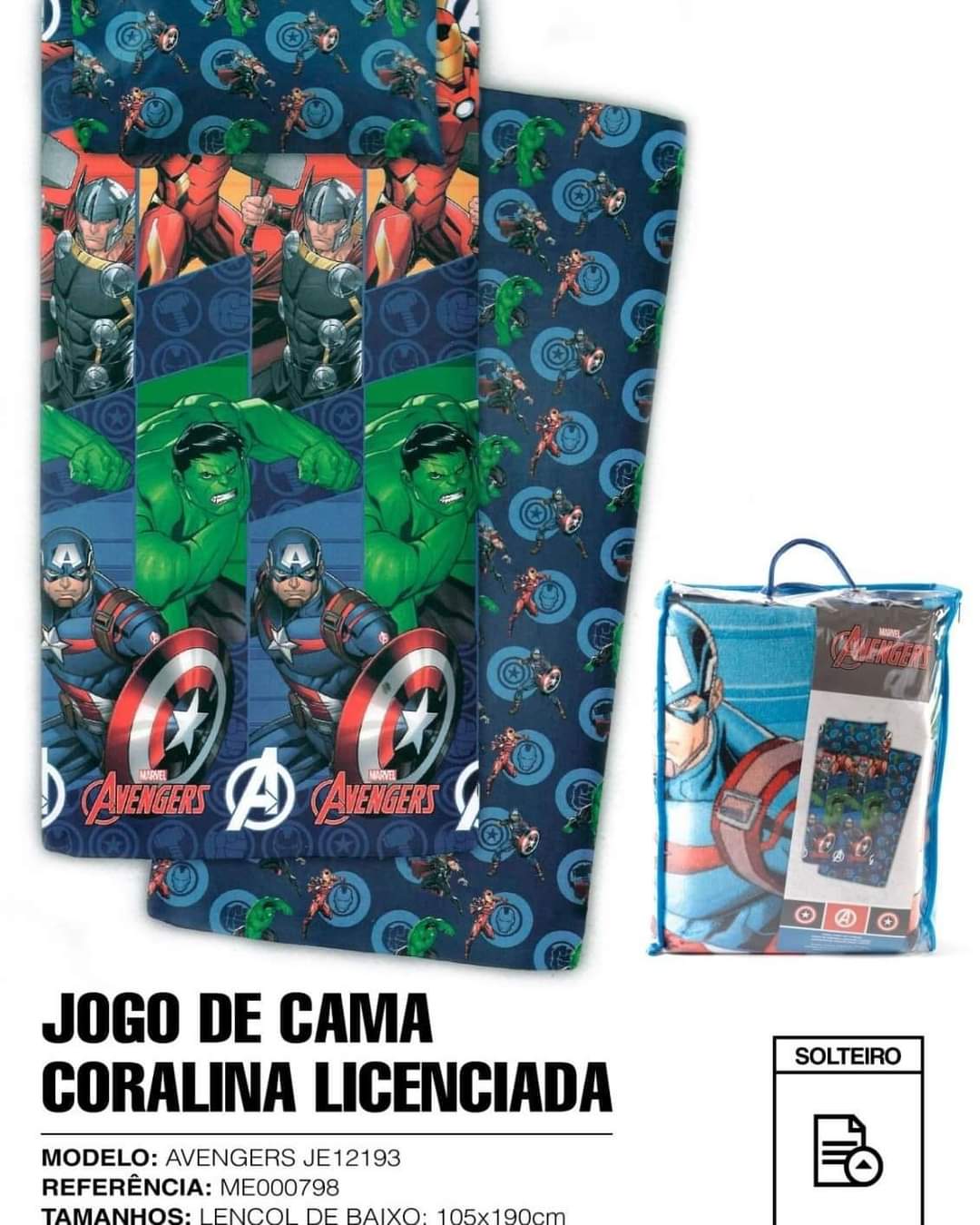 • Jogo de cama Avengers Coralina licença com personagens em fundo azul e embalagem plástica