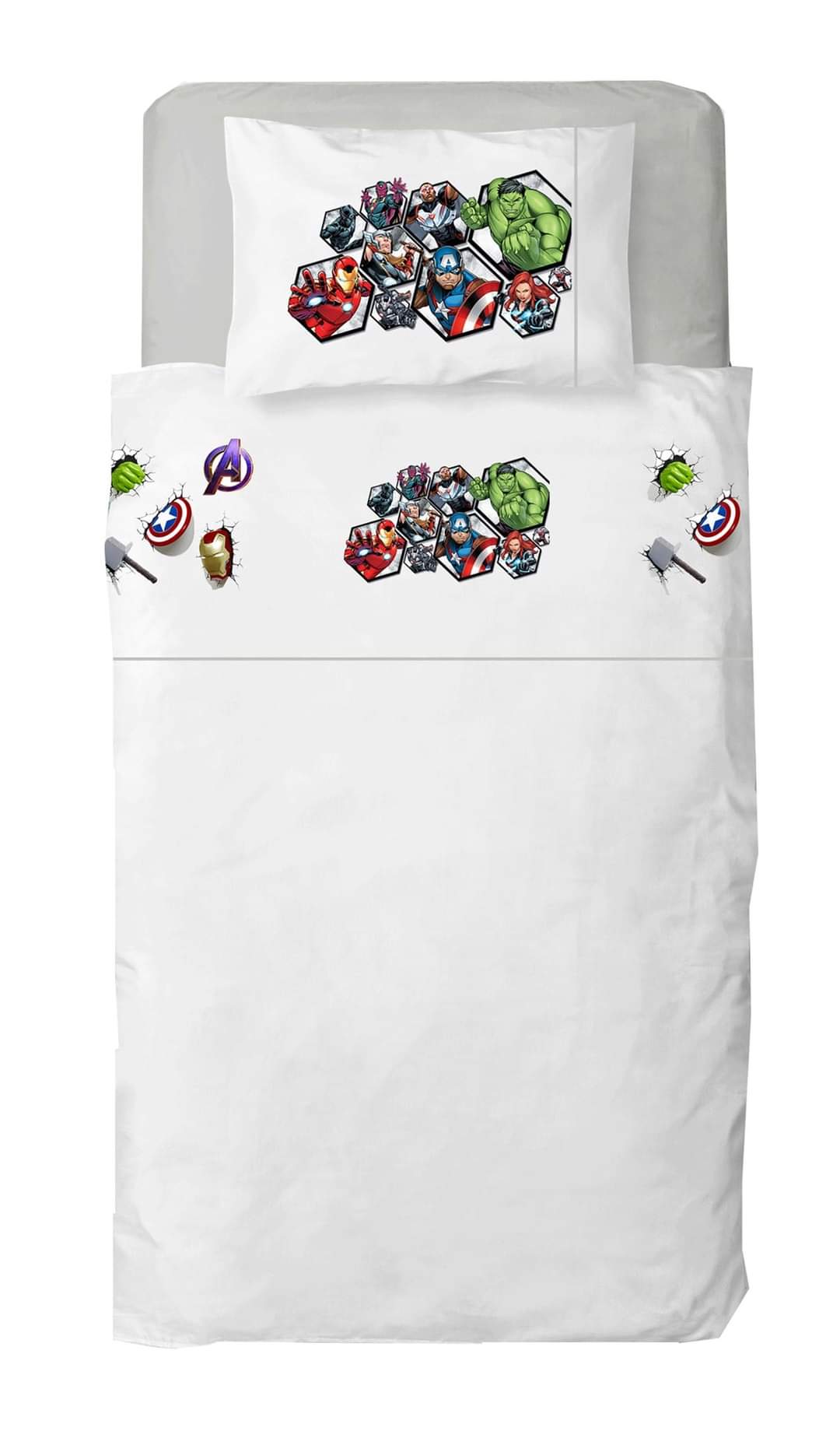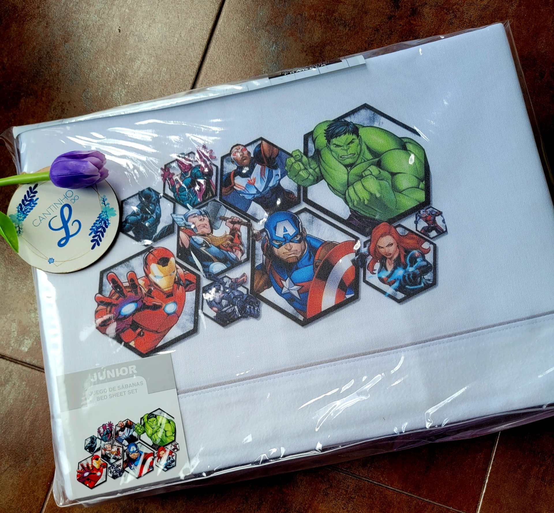 • Jogo de cama infantil branco com estampado dos Avengers em hexágonos e embalagem de plástico