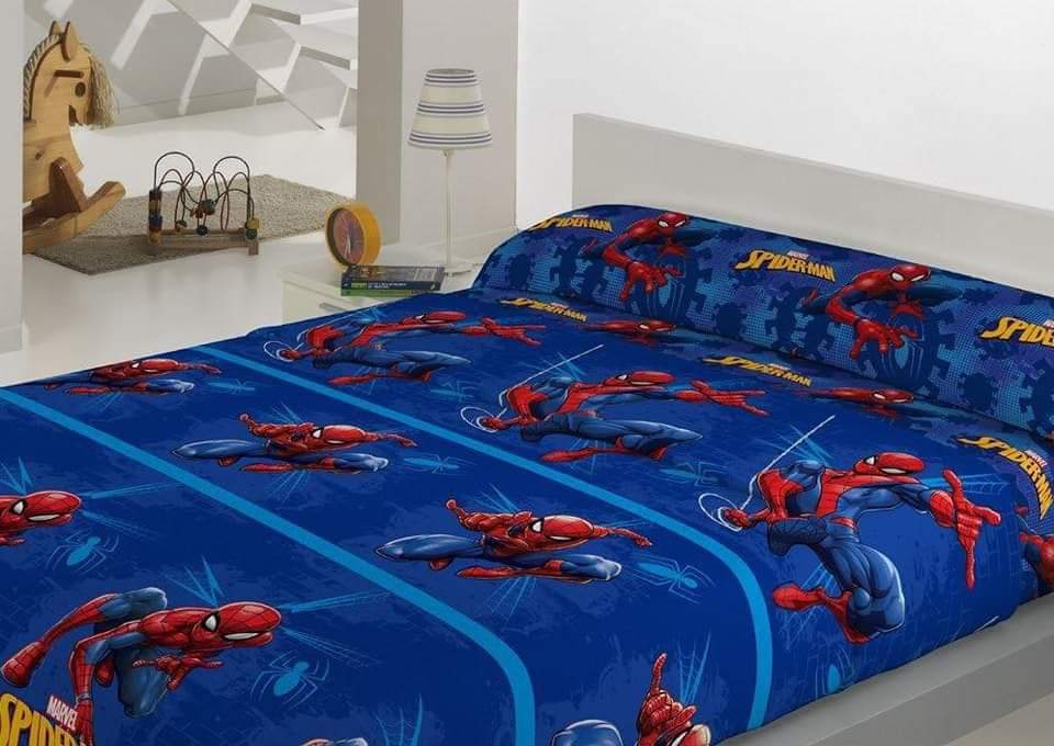• Capa de edredão azul com estampado do Homem-Aranha em cama branca
