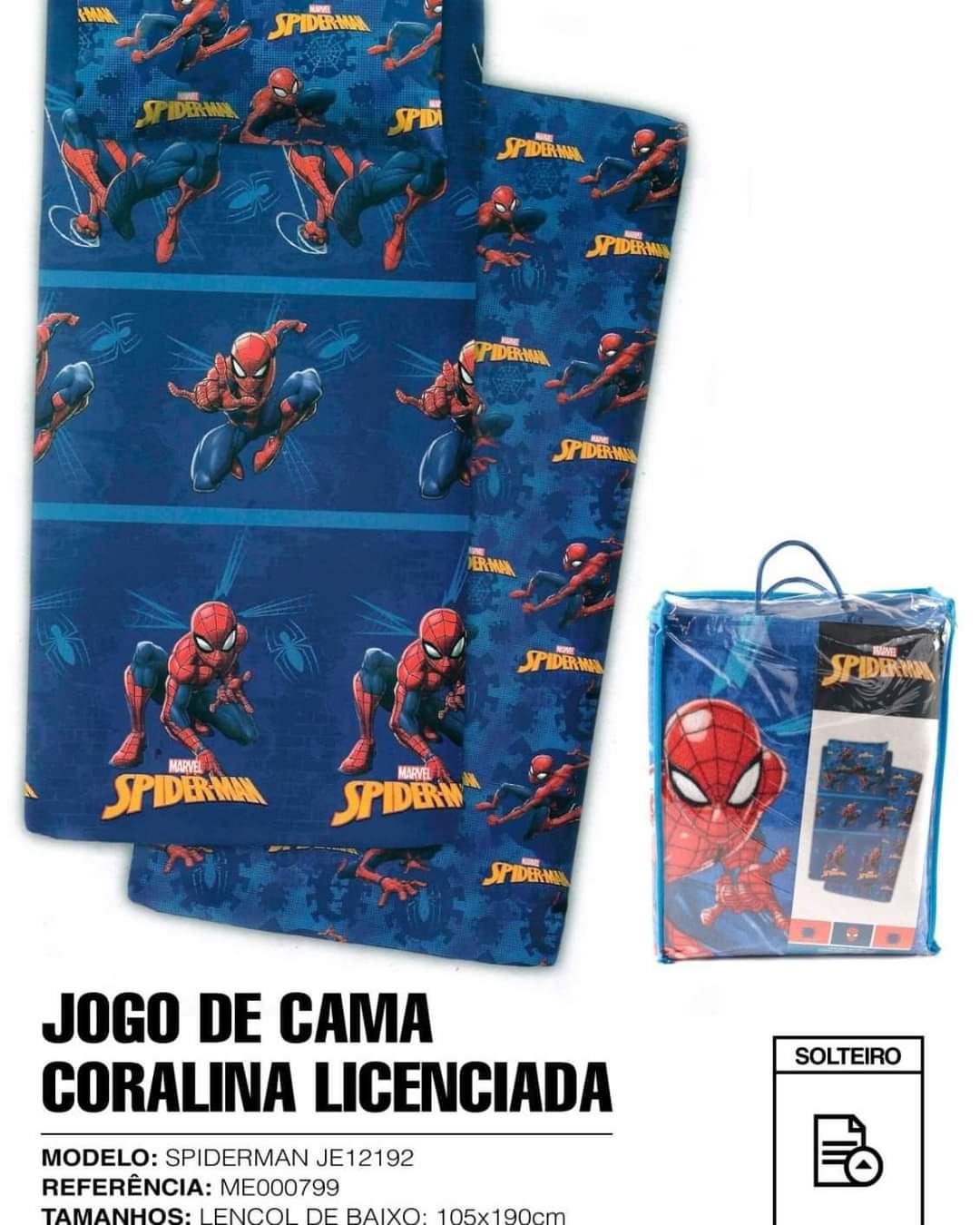 • Jogo de cama coralina azul com padrão Spider-Man e embalagem plástica.