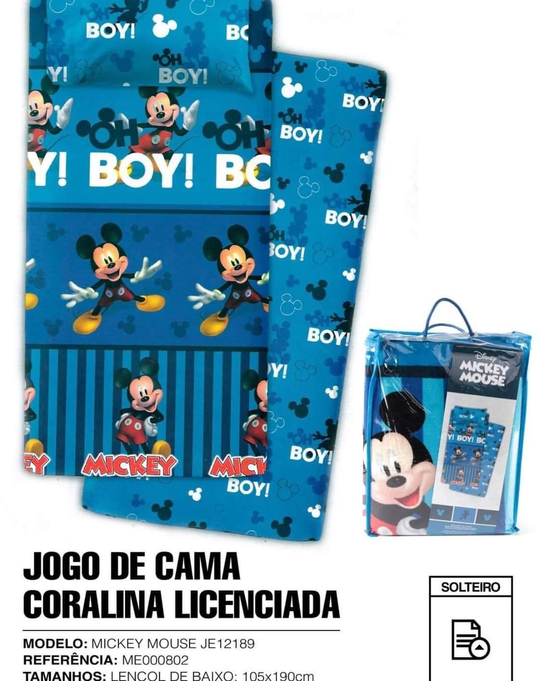 • Jogo de cama azul com estampas de Mickey Mouse e texto BOY, embalagem plástica com imagem do produto