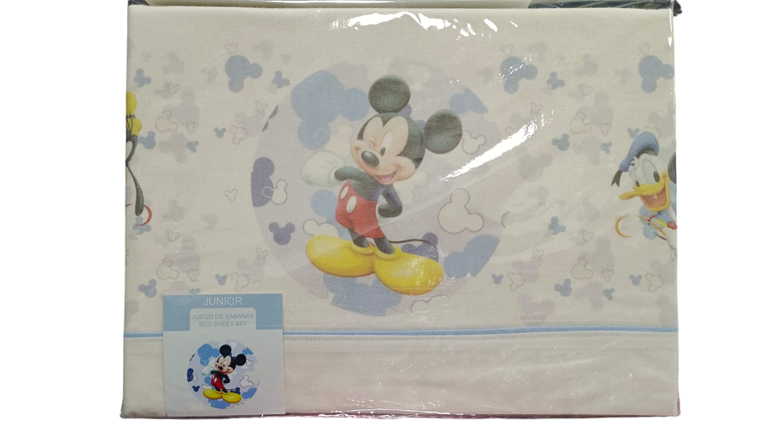 Conjunto de roupa de cama infantil com padrão Disney e embalagem plástica.