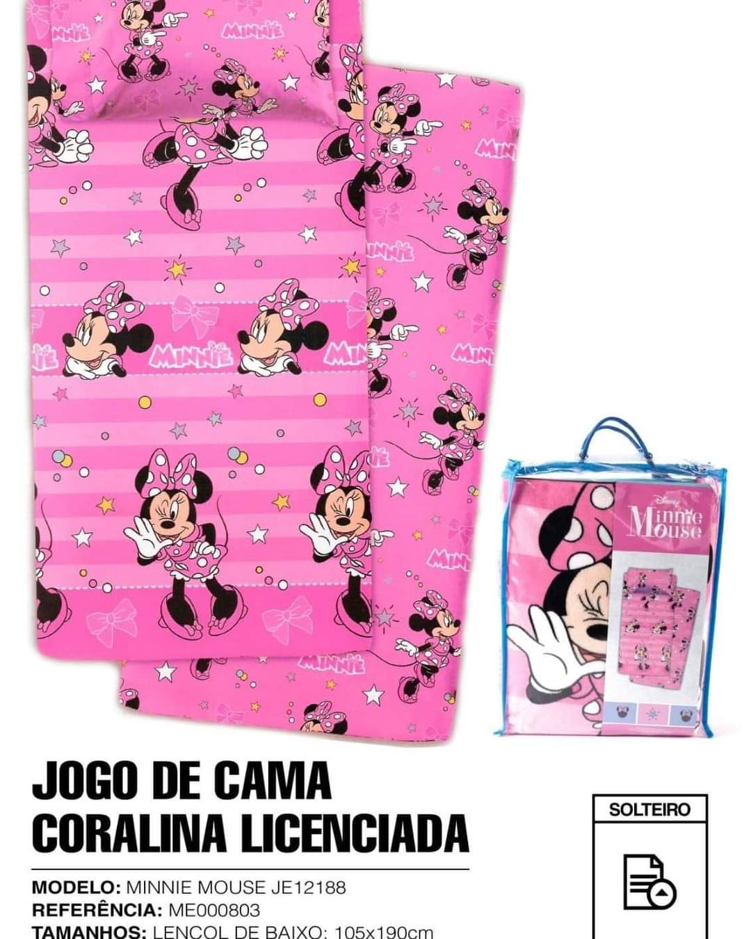 • Jogo de cama rosa com padrão Minnie Mouse e embalagem transparente contendo o produto.