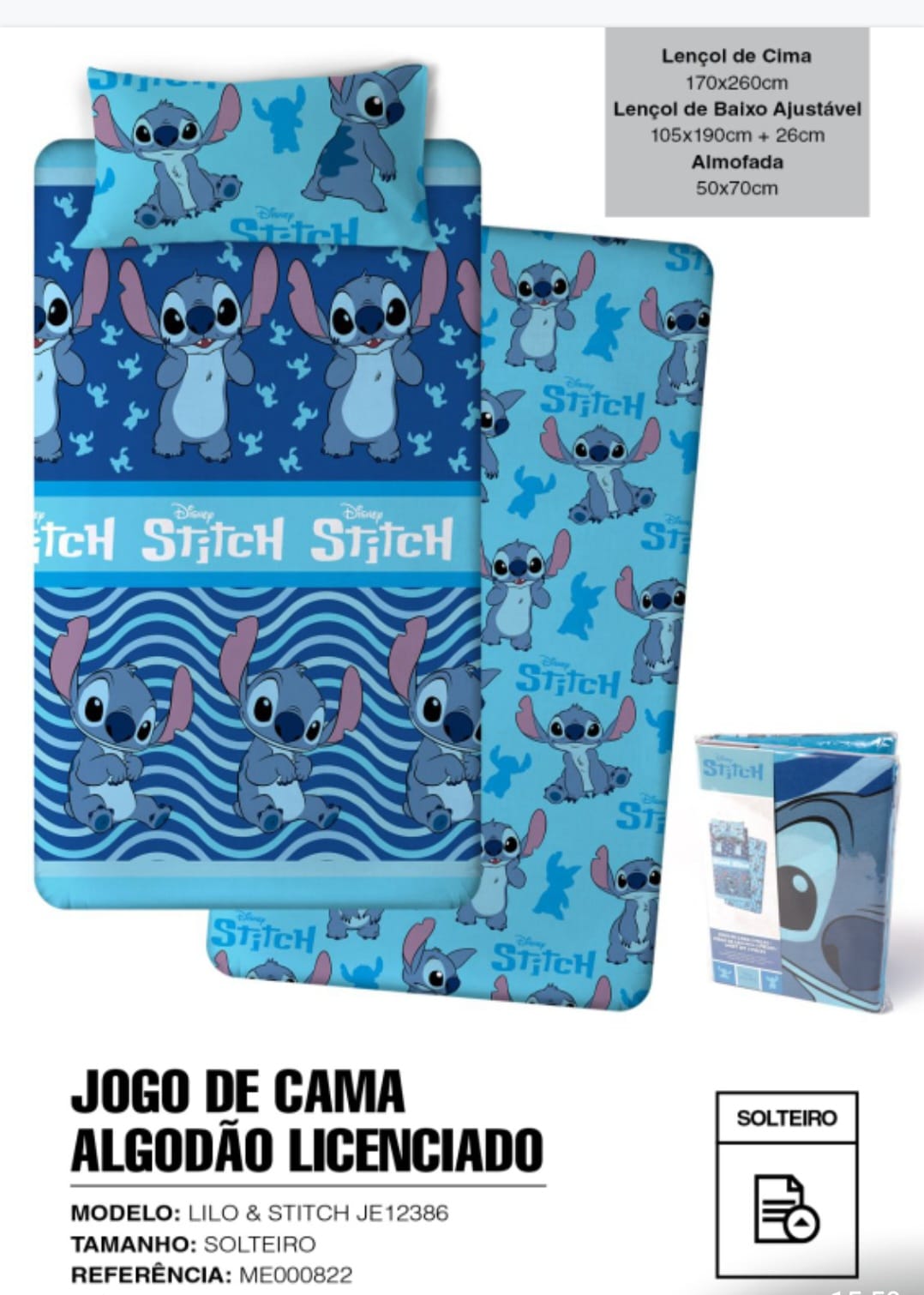 Lençóis Stitch Azul Algodão 35,00 € Desconto de %. Partilhar Tamanho Solteiro Comprar Contactar Lençóis cama de: solteiro Lençol de baixo ajustável 105×190cm + 26cm Lençol de cima 170×260cm Fronha almofada 50×70cm algodão