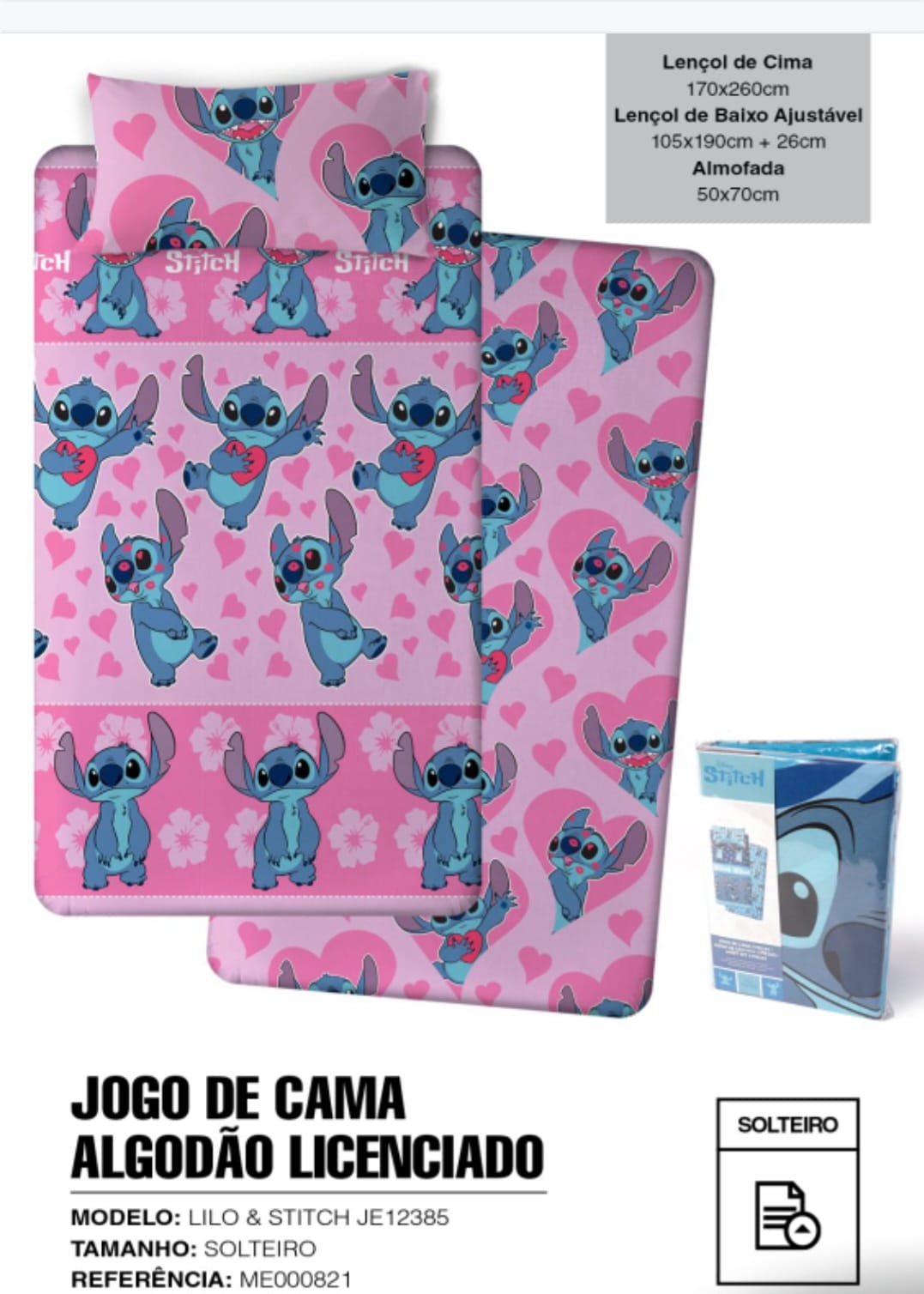 Lençóis Stitch rosa Algodão 35,00 € Desconto de %. Partilhar Tamanho Solteiro Comprar Contactar Lençóis cama de: solteiro Lençol de baixo ajustável 105×190cm + 26cm Lençol de cima 170×260cm Fronha almofada 50×70cm algodão