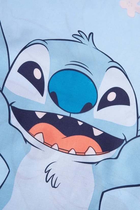 • Roupa de cama infantil com padrão dos personagens Stitch e Lilo, azul claro