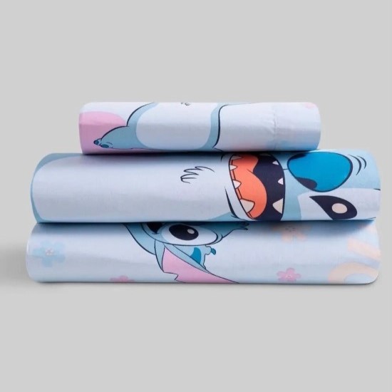 • Conjunto roupa de cama com padrão Stitch em azul, branco e rosa