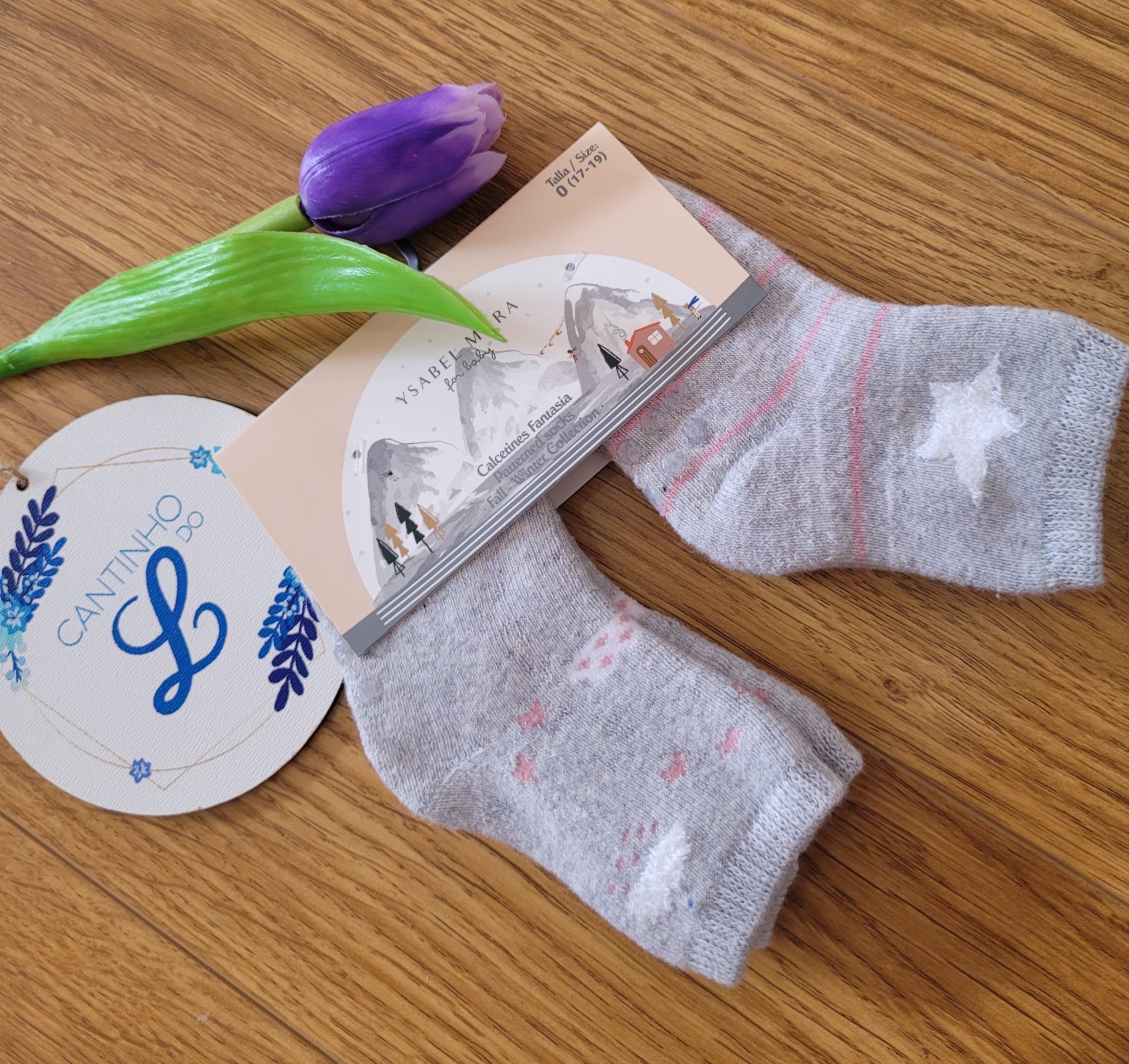 Meias infantis cinzentas com estrelas e corações em fundo de madeira, etiqueta e flor roxa.