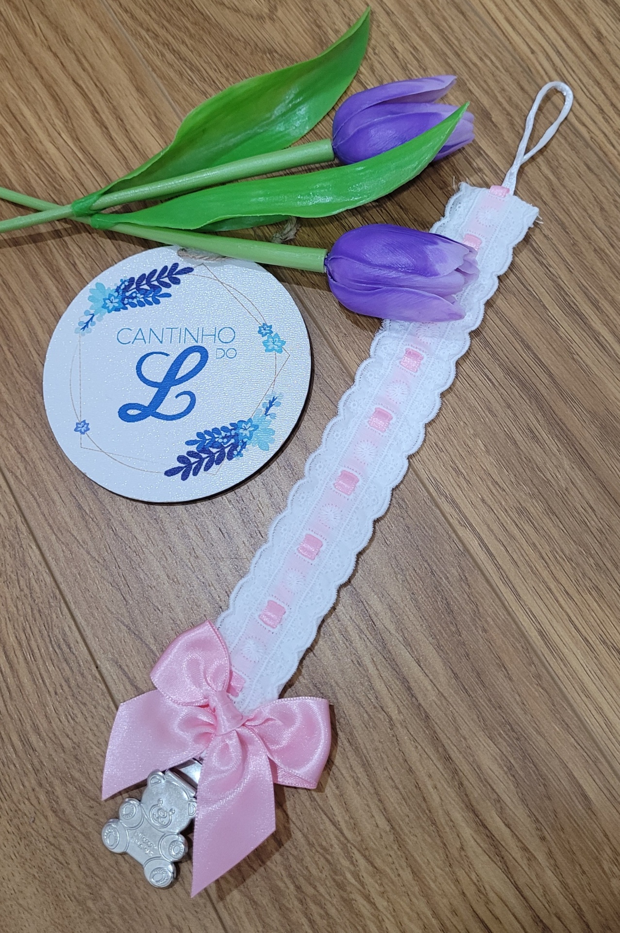 • Fita de chupeta branca e rosa com laço e ursinho, tulipas roxas artificiais e um cartão redondo em fundo de madeira