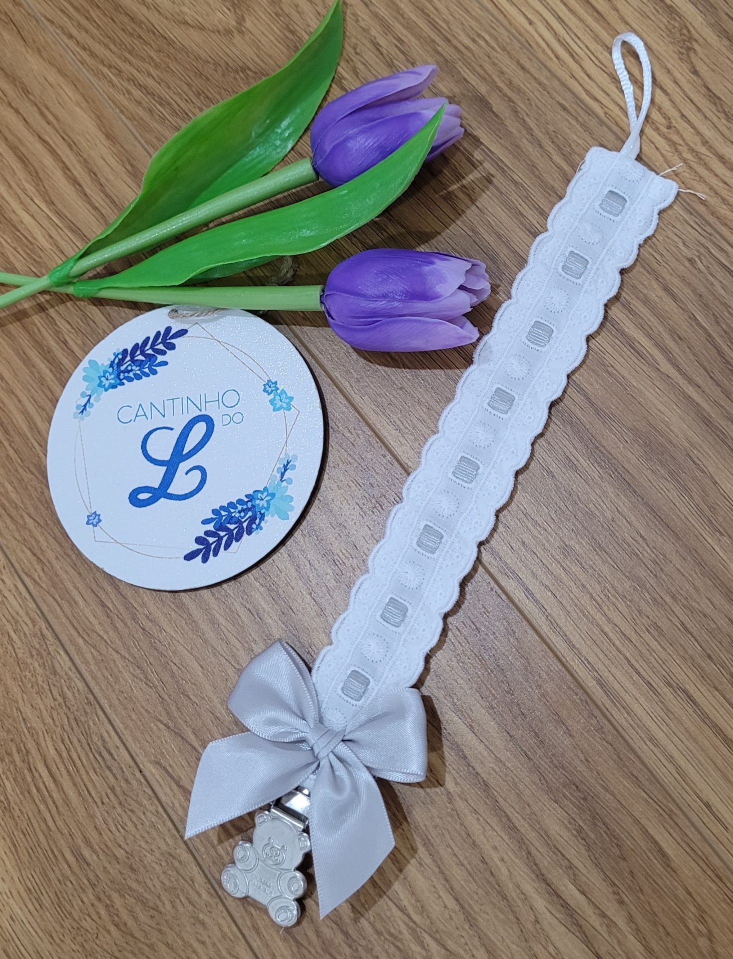 Laço branco com presilha ursinho em madeira, flores roxas artificiais e cartão CANTINHO DO L sobre superfície de madeira