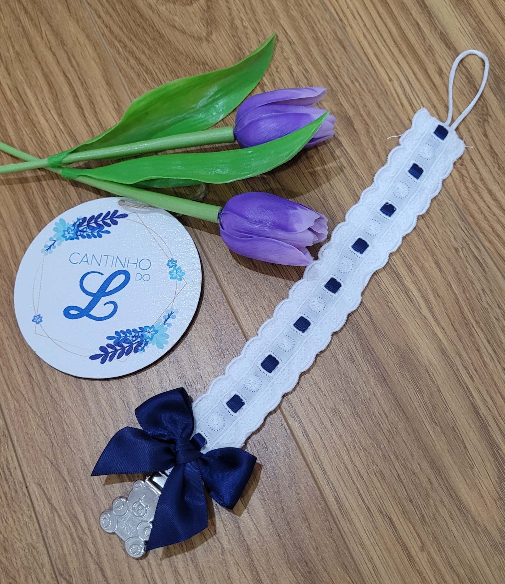 fita branca com laço azul escuro, flores roxas e cartão redondo com texto CANTINHO DO L