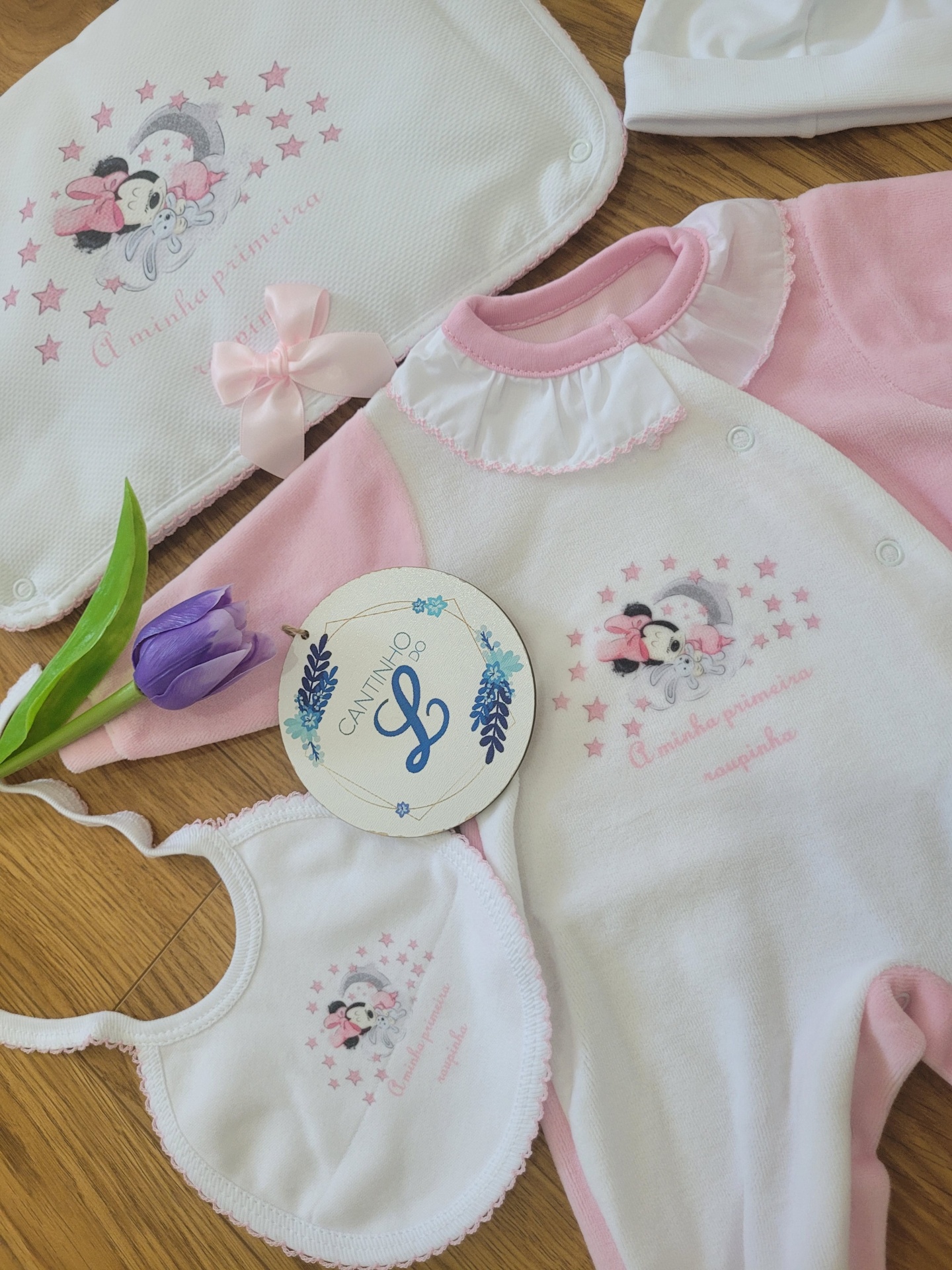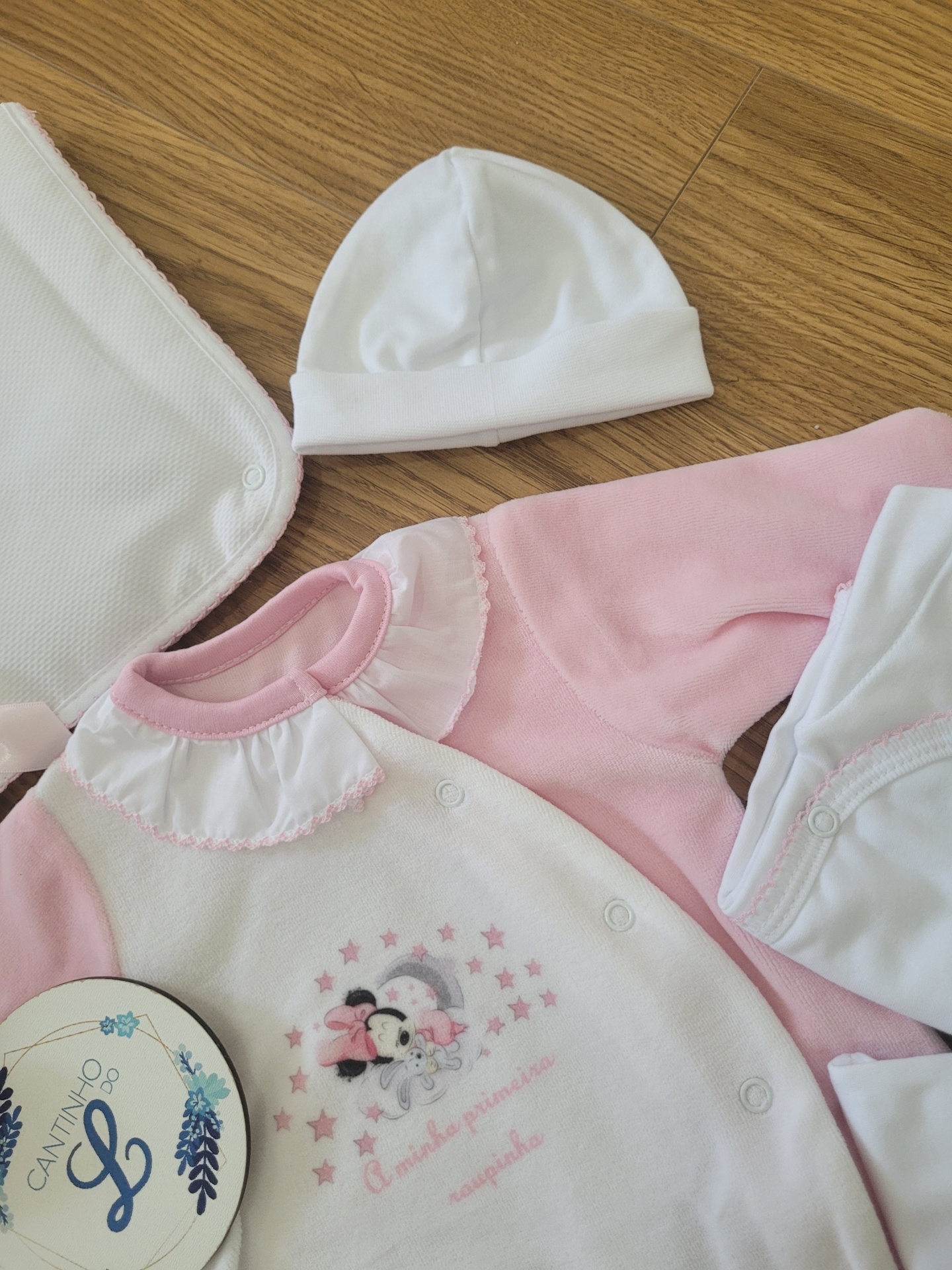 PRIMEIRA ROUPINHA 34,75 € Desconto de %. Partilhar Comprar Contactar Kit primeira roupinha construído por babygrow, body, calcinha, gorro , babete e o saquinho para levar as pecinhas para a sala de partos... Babygrow em veludo... Restantes peças 100% algodão Tamanho único Pode ainda enriquecer o enxoval combinando a toalha de banho e a fralda do mesmo tema..